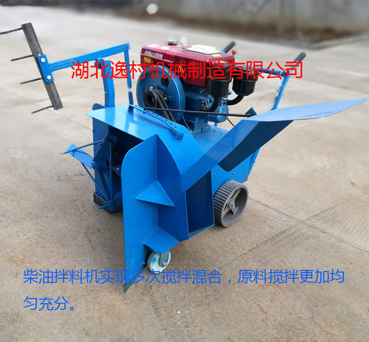 堆積的原料經(jīng)由柴油拌料機料耙送入喂料輪,然后由離心風輪加速拋出出料口,在經(jīng)過三道運料的同時實現(xiàn)多次攪拌混合,原料攪拌更加均勻充分。