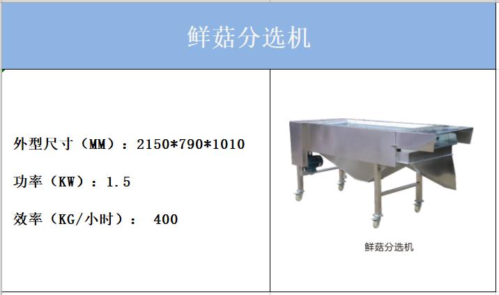 逸村鮮菇篩選機(jī)設(shè)為2層,即2層篩網(wǎng),外形尺寸:2150*790*1010mm,功率:1.5kw,工作效率可達(dá)400kg/小時。