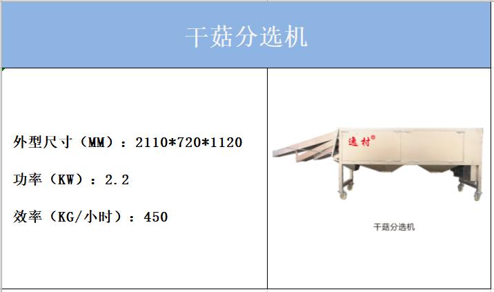 逸村干菇篩選機(jī)設(shè)為4層,即4層篩網(wǎng),外形尺寸:2110*720*1120mm,干菇機(jī)功率相對于鮮菇機(jī)要搞,功率2.2kw,工作效率達(dá)450kg/小時。